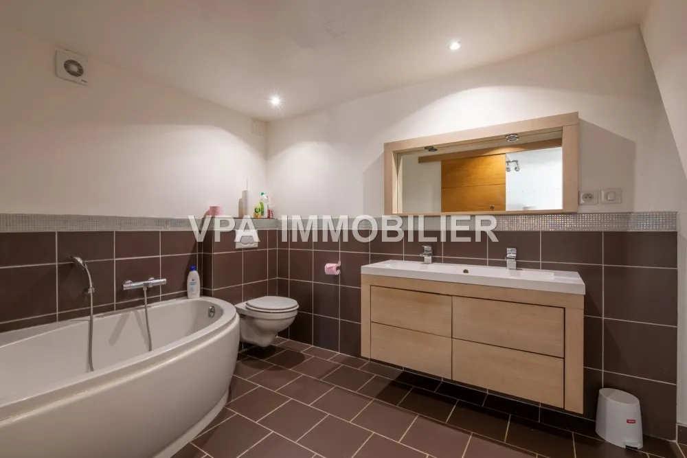 On the garden level, you will find a pleasant living room with open-plan kitchen and direct access outside, one bedroom with the possibility of creating a second, a technical room, a bathroom, a shower room, two WCs and a cellar.