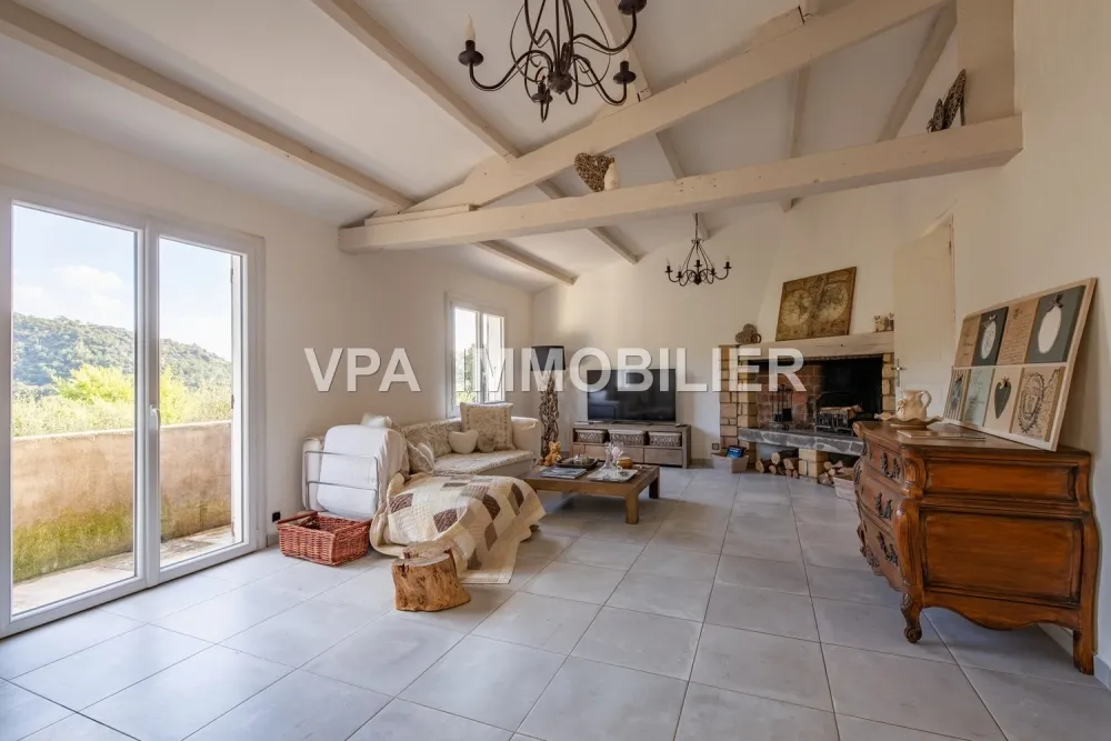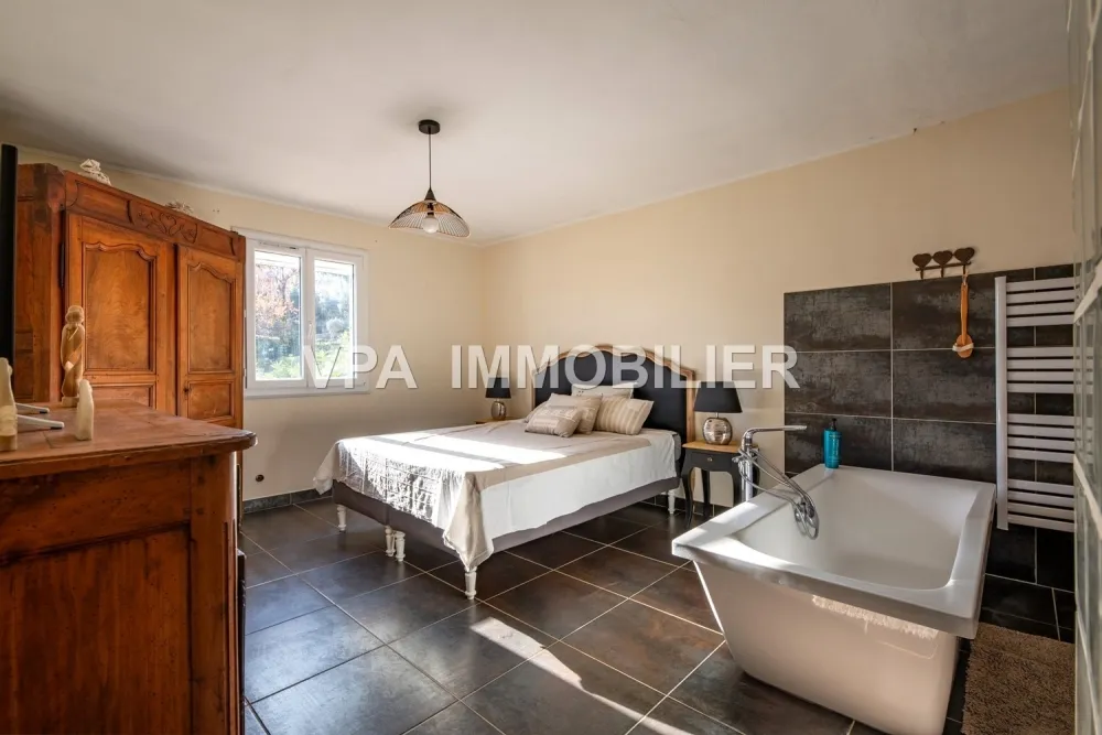 Le jardin arboré, la piscine et la vue dégagée sur les collines environnantes confèrent à l’ensemble un cadre de vie privilégié, intimiste et verdoyant, tout en restant proche des commodités du village.